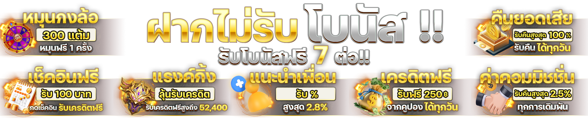 เริ่มต้นด้วยโปรโมชั่นคืนยอดเสียที่มอบให้สมาชิกทุกวัน โดยคุณจะได้รับเงินคืน 10% จากยอดเสียสะสมรายวัน ไม่ว่าคุณจะเล่นเกมไหน ก็มีสิทธิ์ได้รับเงินคืนทั้งหมด นอกจากนี้ยังมีโบนัสแรกเข้าสำหรับสมาชิกใหม่สูงถึง 100% เพียงแค่ทำการฝากเงินครั้งแรก